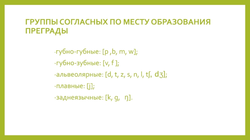 Слайд 14ГРУППЫ СОГЛАСНЫХ ПО МЕСТУ ОБРАЗОВАНИЯ ПРЕГРАДЫ