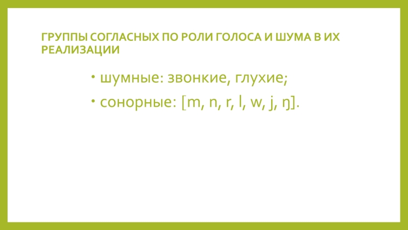 Слайд 12ГРУППЫ СОГЛАСНЫХ ПО РОЛИ ГОЛОСА И ШУМА В ИХ РЕАЛИЗАЦИИ