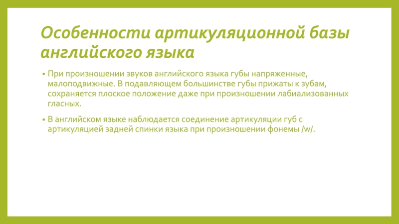 Слайд 5Английская артикуляционная база характеризуется наличием скользящей артикуляции гласных, плавным переходом