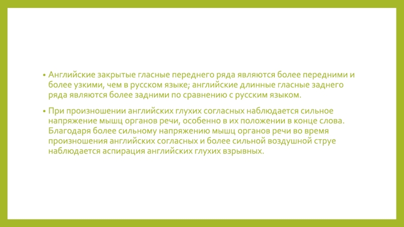 Слайд 3Английские закрытые гласные переднего ряда являются более передними и более