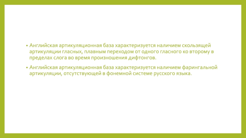 Английская артикуляционная база характеризуется наличием фарингальной артикуляции, отсутствующей в фонемной системе русского языка.