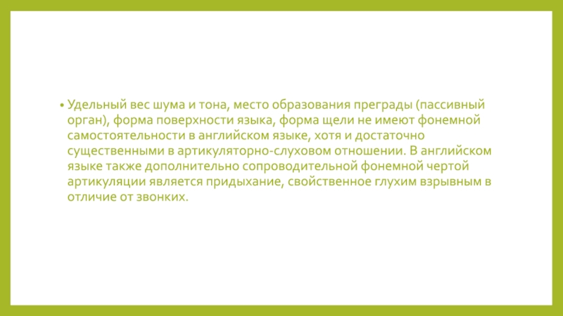 английском языке, хотя и достаточно существенными в артикуляторно-слуховом отношении. В английском языке также дополнительно сопроводительной фонемной чертой артикуляции является придыхание, свойственное глухим взрывным в отличие от звонких.