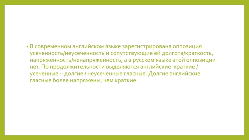 продолжительности выделяются английские краткие / усеченные :: долгие / неусеченные гласные. Долгие английские гласные более напряжены, чем краткие.