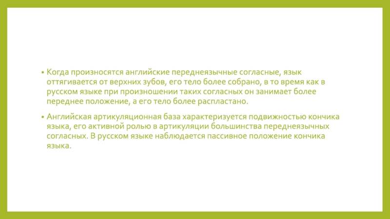 Слайд 4Когда произносятся английские переднеязычные согласные, язык оттягивается от верхних зубов,