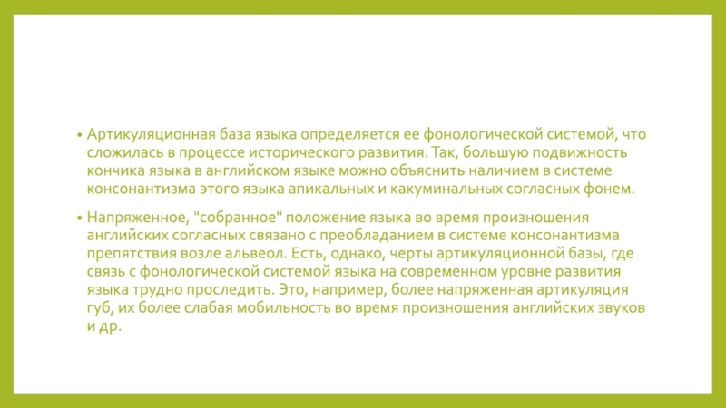 Слайд 6Артикуляционная база языка определяется ее фонологической системой, что сложилась в