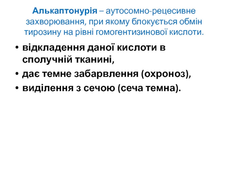 Слайд 21Алькаптонурія – аутосомно-рецесивне захворювання, при якому блокується обмін тирозину на