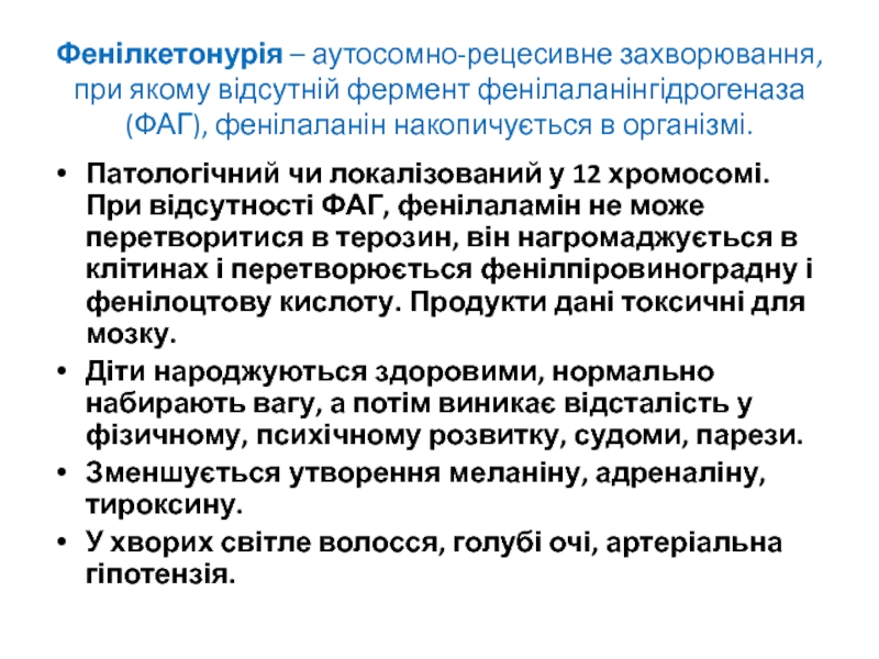 Фенілкетонурія – аутосомно-рецесивне захворювання, при якому відсутній фермент фенілаланінгідрогеназа (ФАГ),