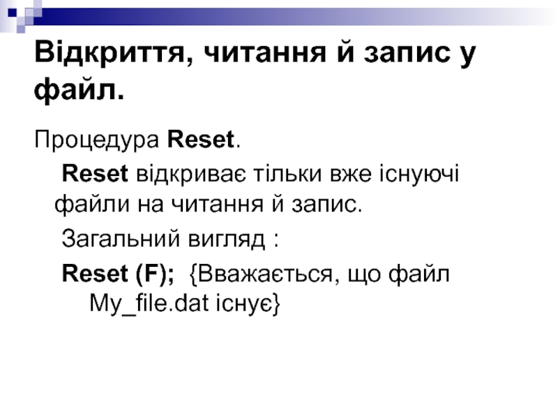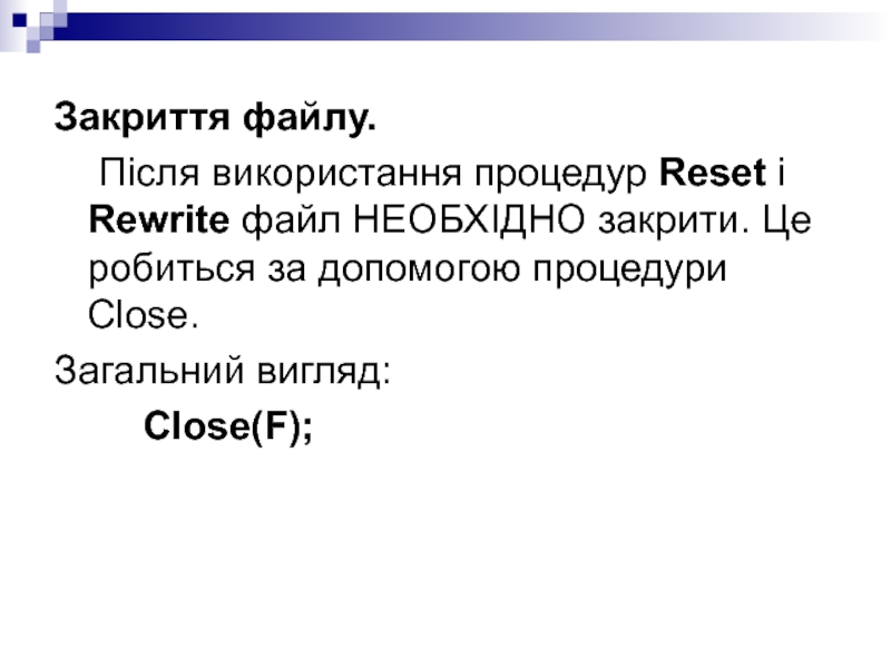 Після використання процедур Reset і Rewrite файл НЕОБХІДНО закрити.