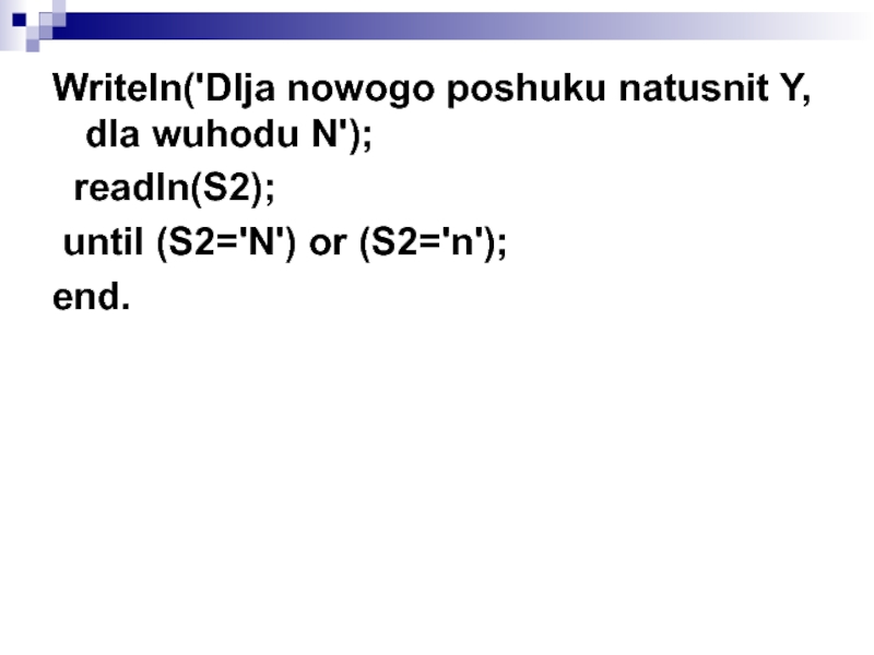 Слайд 33Writeln('Dlja nowogo poshuku natusnit Y, dla wuhodu N');