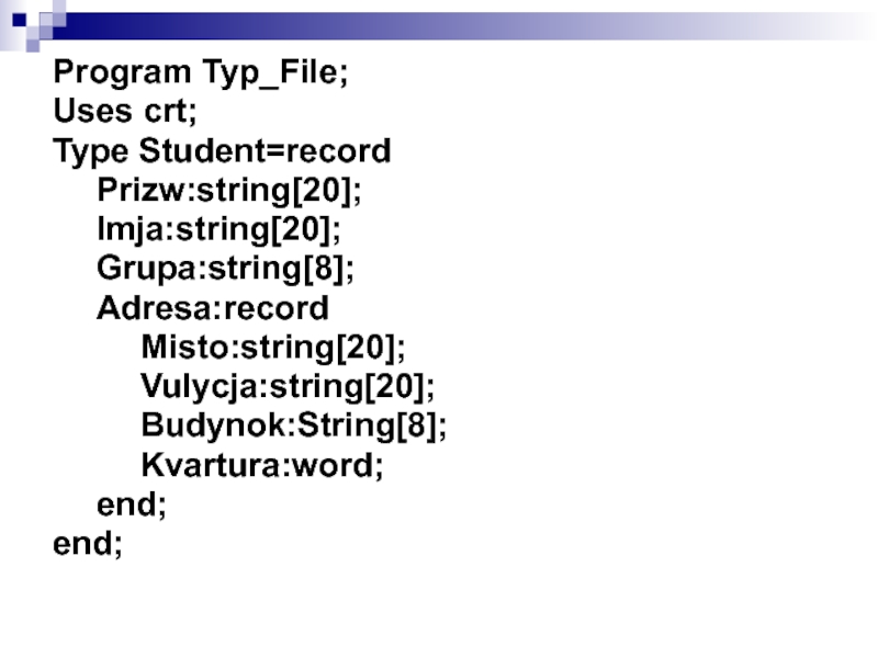 Нехай потрібно створити масив даних студентів першого курсу: прізвище, ім’я, група, домашня адреса. Цей масив записати в типований файл, виконати читання із файлу в новий масив і вивести дані студентів на задану літеру. Програма що вирішує дане завдання наведена нижче.