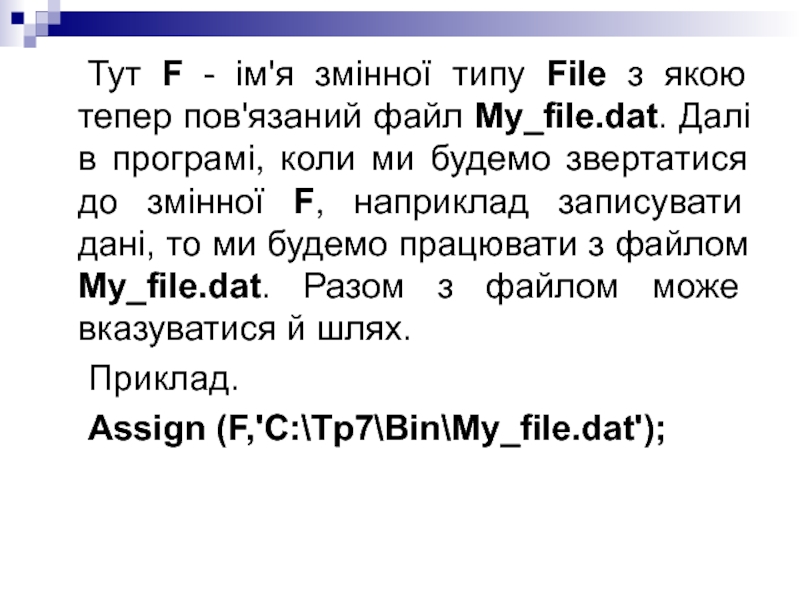 до змінної F, наприклад записувати дані, то ми будемо працювати з файлом My_file.dat. Разом з файлом може вказуватися й шлях.