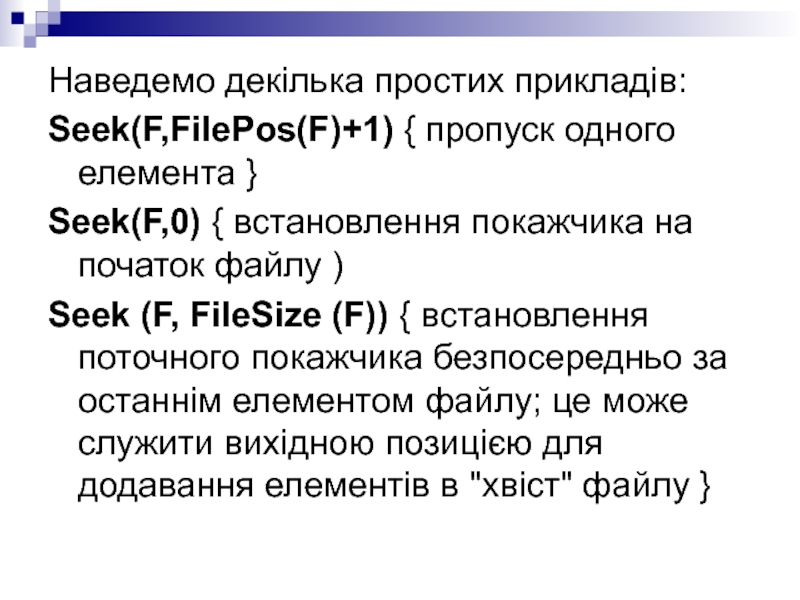 SEEK(F,N); N - номер елемента у файлі. Процедура має два параметри: змінну файлового типу й ціле (типу longint). Другий параметр розуміється як порядковий номер елементу файлу, на який необхідно встановити покажчик.