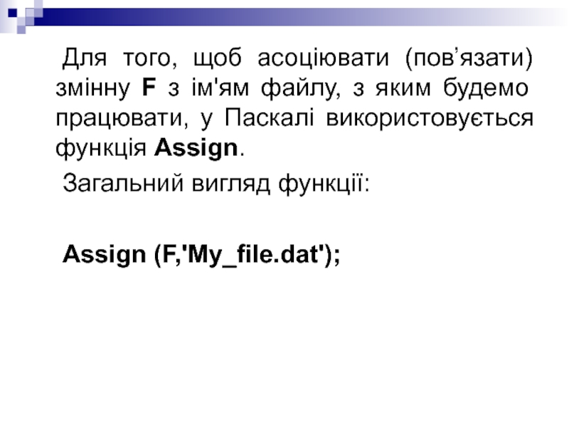 Слайд 8 Для того, щоб асоціювати (пов’язати) змінну F з ім'ям файлу,