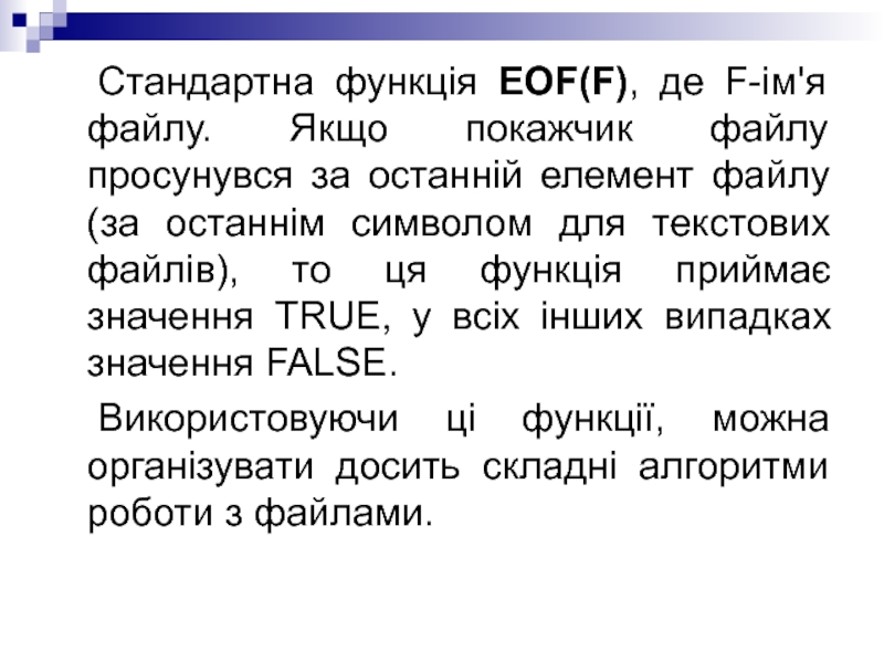 Слайд 21 Стандартна функція EOF(F), де F-ім'я файлу. Якщо покажчик файлу просунувся