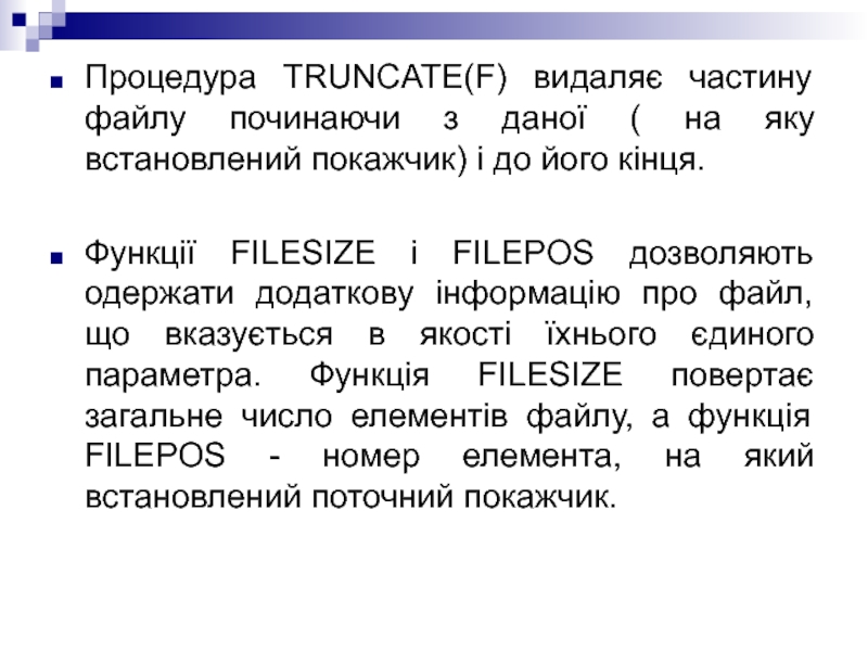 FILEPOS дозволяють одержати додаткову інформацію про файл, що вказується в якості їхнього єдиного параметра. Функція FILESIZE повертає загальне число елементів файлу, а функція FILEPOS - номер елемента, на який встановлений поточний покажчик.