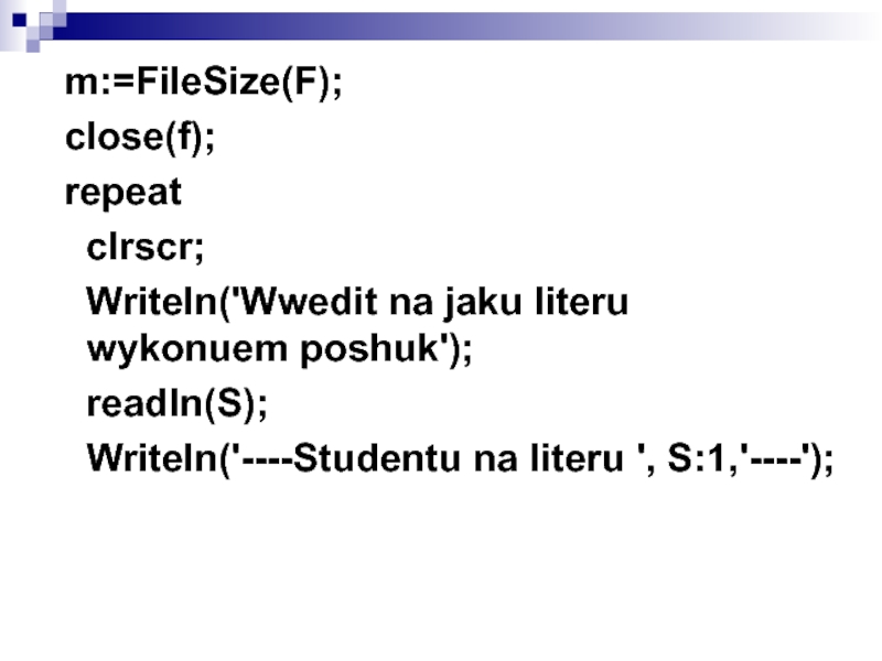 Слайд 31 m:=FileSize(F);