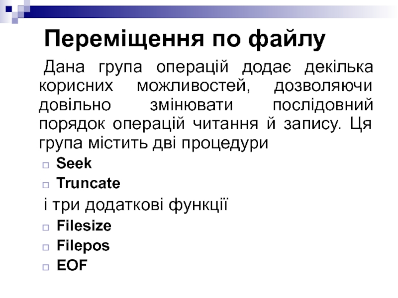 Слайд 17 Перераховані процедури і функції безпосередньо працюють із поточним покажчиком файлу.