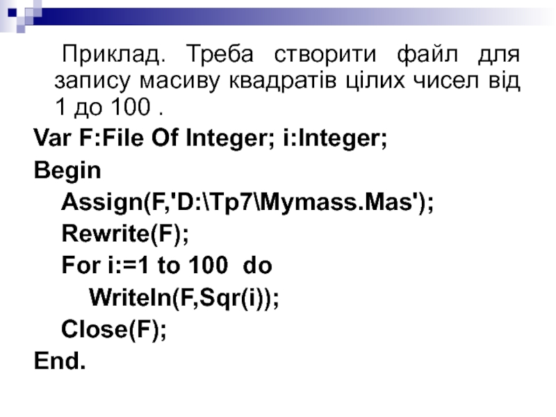 Слайд 13 Приклад. Треба створити файл для запису масиву квадратів цілих чисел