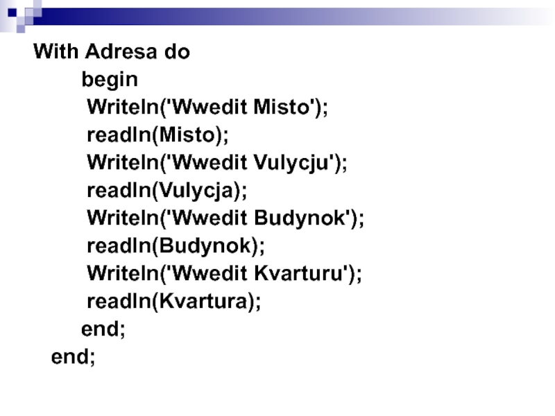 Writeln('Adresa: ',Misto,', ',Vulycja,', ', Budynok,'/',Kvartura);