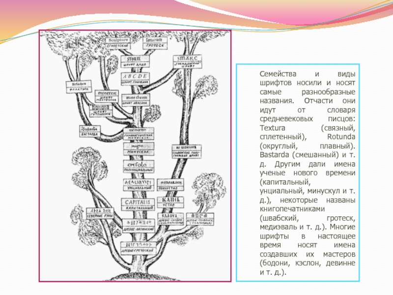 Лучшие шрифты нашего времени созданы выдающимися художниками шрифта. Их благородные формы возникли в итоге изучения красоты и практичности всех прежних шрифтов. Создать шрифт могут лишь немногие. Шрифтовое оформление требует больших практических знаний. Типографские шрифты часто называют по имени создателей, но иногда им даются звучные собственные имена.