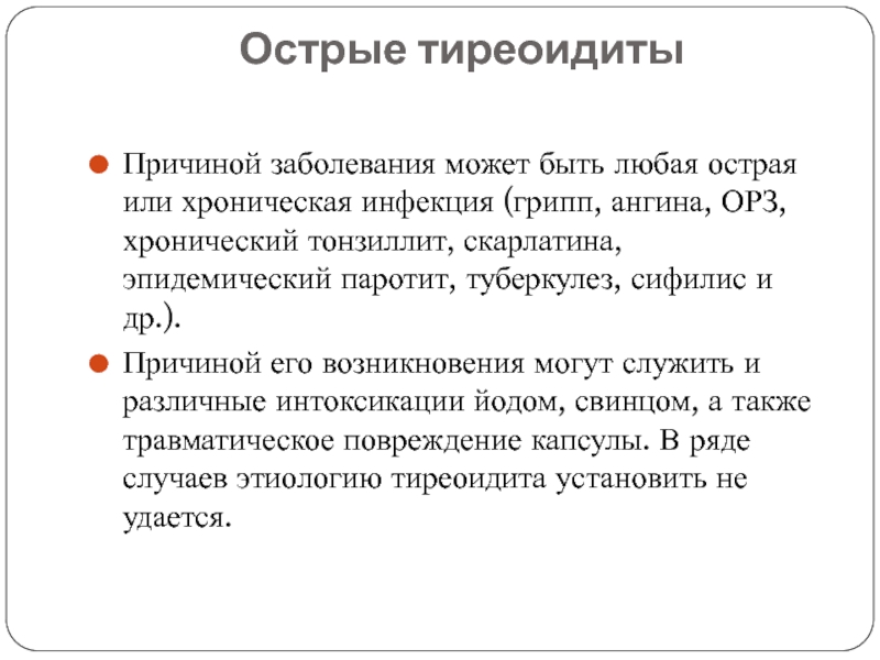 Причиной его возникновения могут служить и различные интоксикации йодом, свинцом, а также травматическое повреждение капсулы. В ряде случаев этиологию тиреоидита установить не удается.