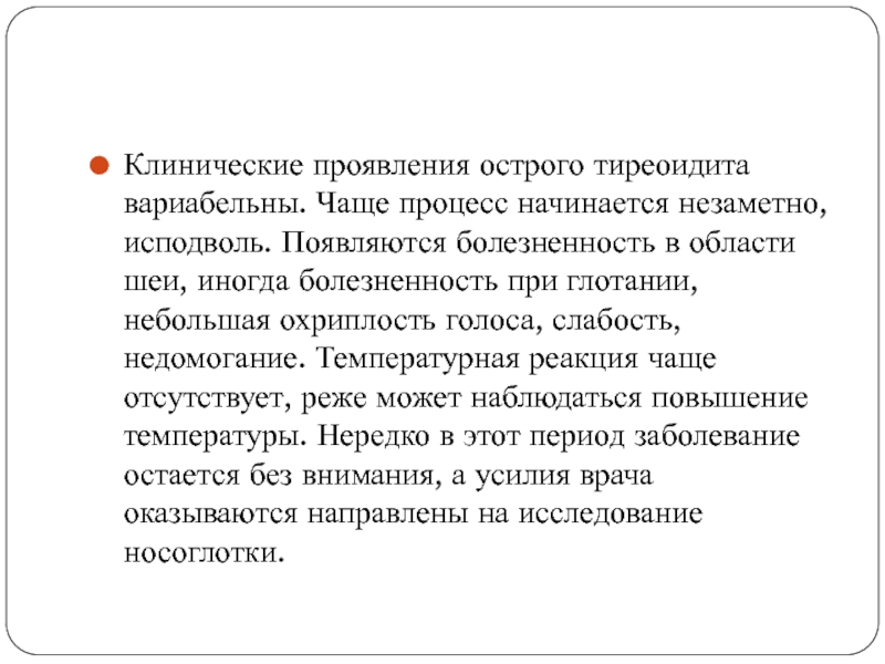 Слайд 6Клинические проявления острого тиреоидита вариабельны. Чаще процесс начинается незаметно, исподволь.