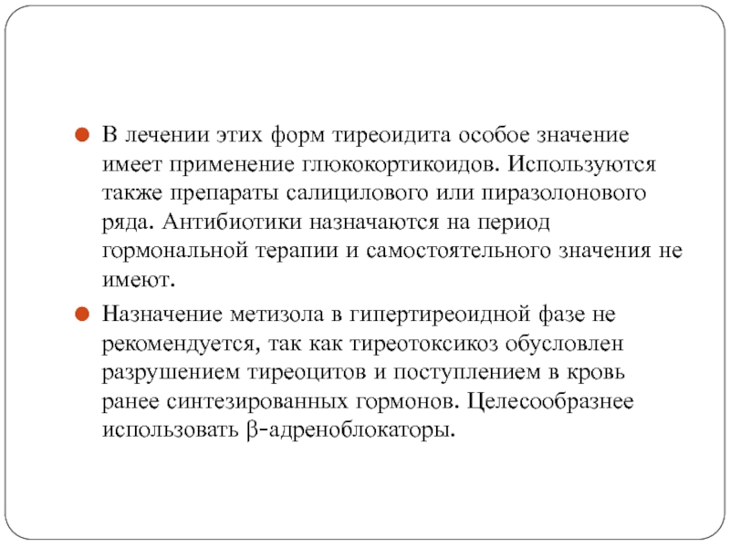 Слайд 13В лечении этих форм тиреоидита особое значение имеет применение глюкокортикоидов.