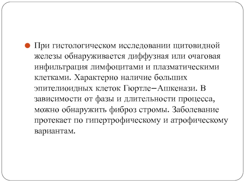 Слайд 25При гистологическом исследовании щитовидной железы обнаруживается диффузная или очаговая инфильтрация