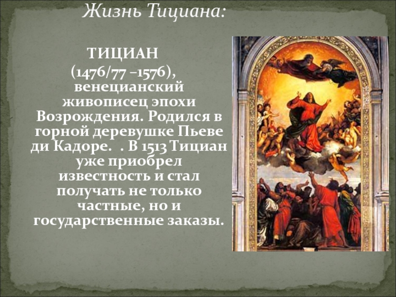 известность и стал получать не только частные, но и государственные заказы. Жизнь Тициана: