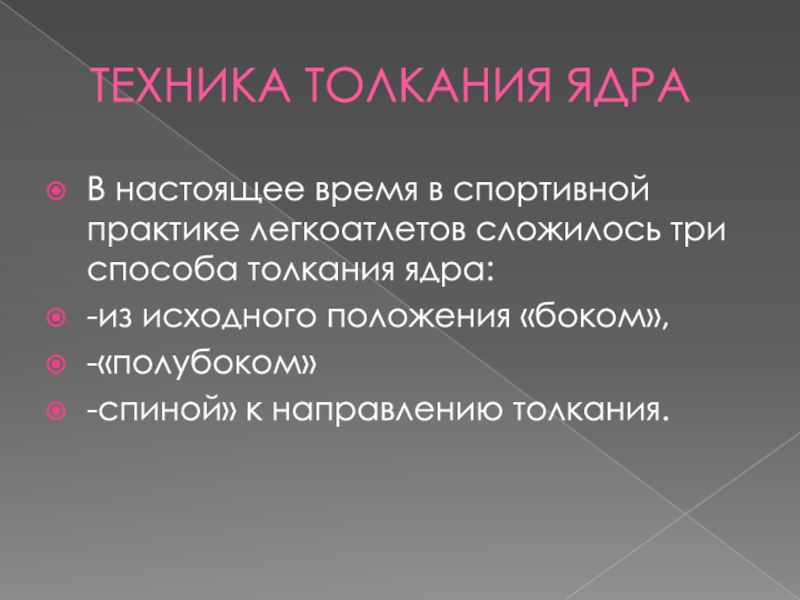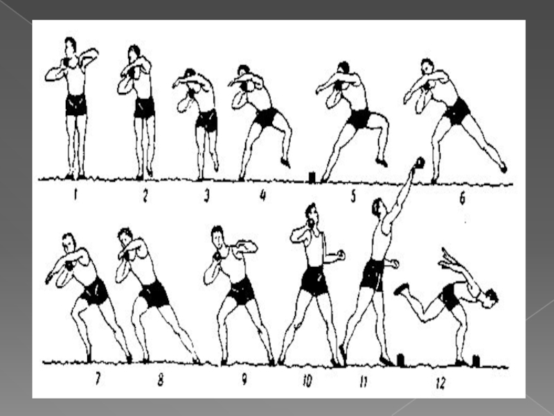Слайд 13Техника толкания ядра из исходного положения «спиной» к направлению толкания