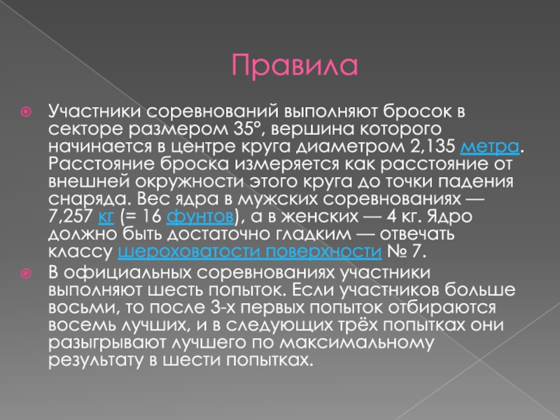 расстояние от внешней окружности этого круга до точки падения снаряда. Вес ядра в мужских соревнованиях — 7,257 кг (= 16 фунтов), а в женских — 4 кг. Ядро должно быть достаточно гладким — отвечать классу шероховатости поверхности № 7.
