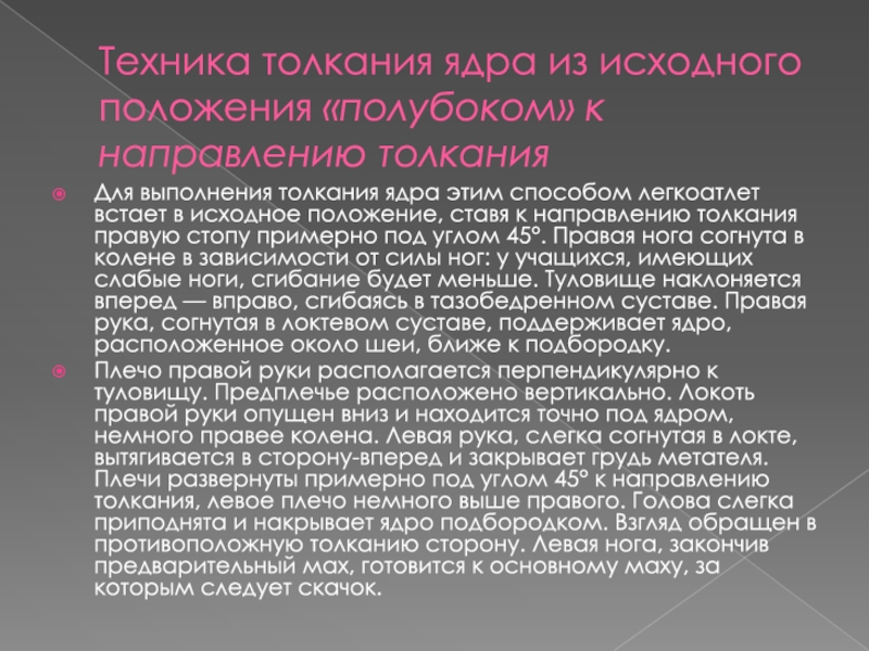 ставя к направлению толкания правую стопу примерно под углом 45°. Правая нога согнута в колене в зависимости от силы ног: у учащихся, имеющих слабые ноги, сгибание будет меньше. Туловище наклоняется вперед — вправо, сгибаясь в тазобедренном суставе. Правая рука, согнутая в локтевом суставе, поддерживает ядро, расположенное около шеи, ближе к подбородку.