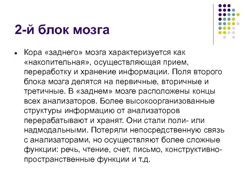 переработку и хранение информации. Поля второго блока мозга делятся на