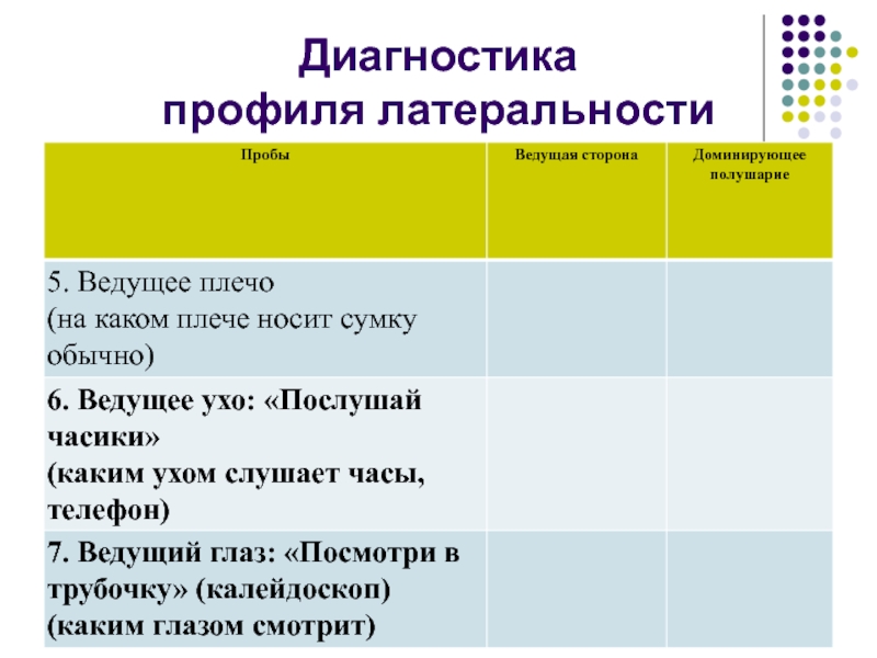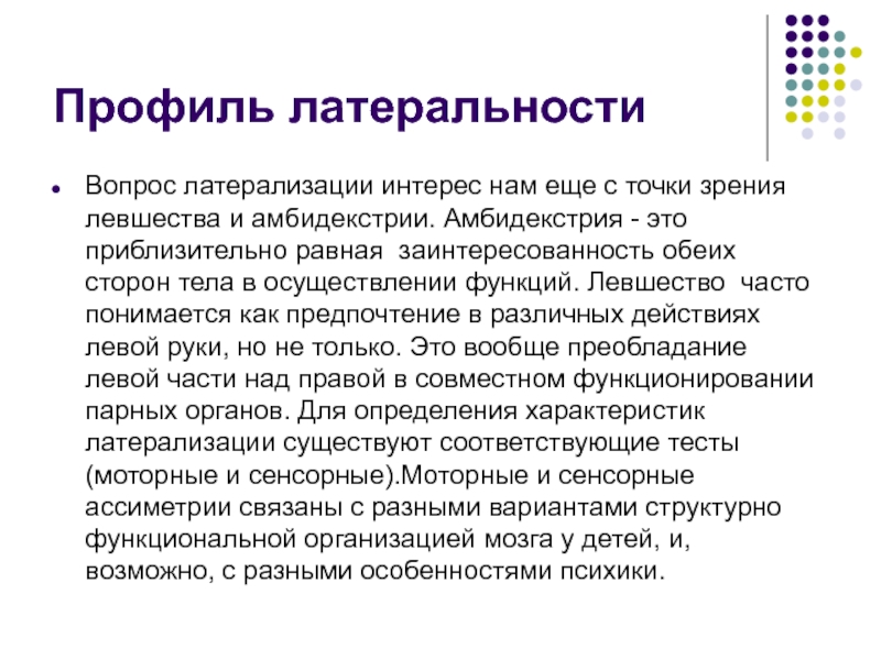сторон тела в осуществлении функций. Левшество часто понимается как предпочтение в различных действиях левой руки, но не только. Это вообще преобладание левой части над правой в совместном функционировании парных органов. Для определения характеристик латерализации существуют соответствующие тесты (моторные и сенсорные).Моторные и сенсорные ассиметрии связаны с разными вариантами структурно функциональной организацией мозга у детей, и, возможно, с разными особенностями психики.