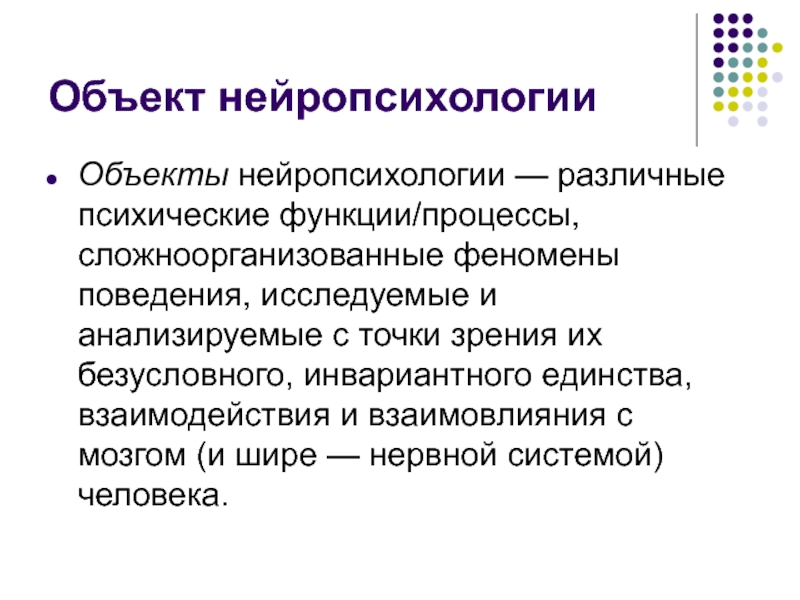 Объекты нейропсихологии — различные психические функции/процессы, сложноорганизованные феномены поведения,