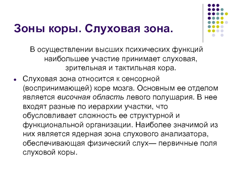 сенсорной (воспринимающей) коре мозга. Основным ее отделом является височная область левого полушария. В нее входят разные по иерархии участки, что обусловливает сложность ее структурной и функциональной организации. Наиболее значимой из них является ядерная зона слухового анализатора, обеспечивающая физический слух— первичные поля слуховой коры.