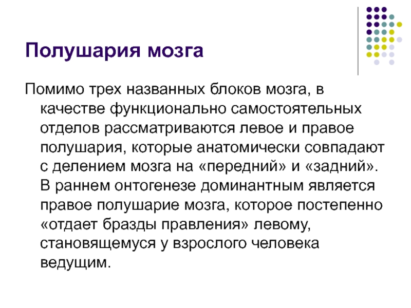 делением мозга на «передний» и «задний». В раннем онтогенезе доминантным является правое полушарие мозга, которое постепенно «отдает бразды правления» левому, становящемуся у взрослого человека ведущим.
