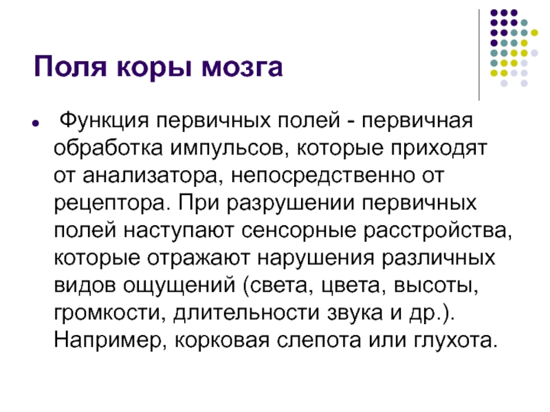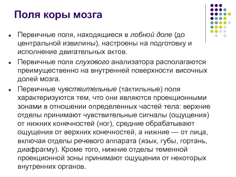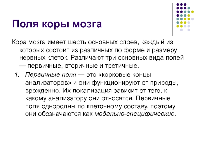 1. Первичные поля — это «корковые концы анализаторов» и они функционируют от природы, врожденно. Их локализация зависит от того, к какому анализатору они относятся. Первичные поля однородны по клеточному составу, поэтому они обозначаются как модально-специфические.