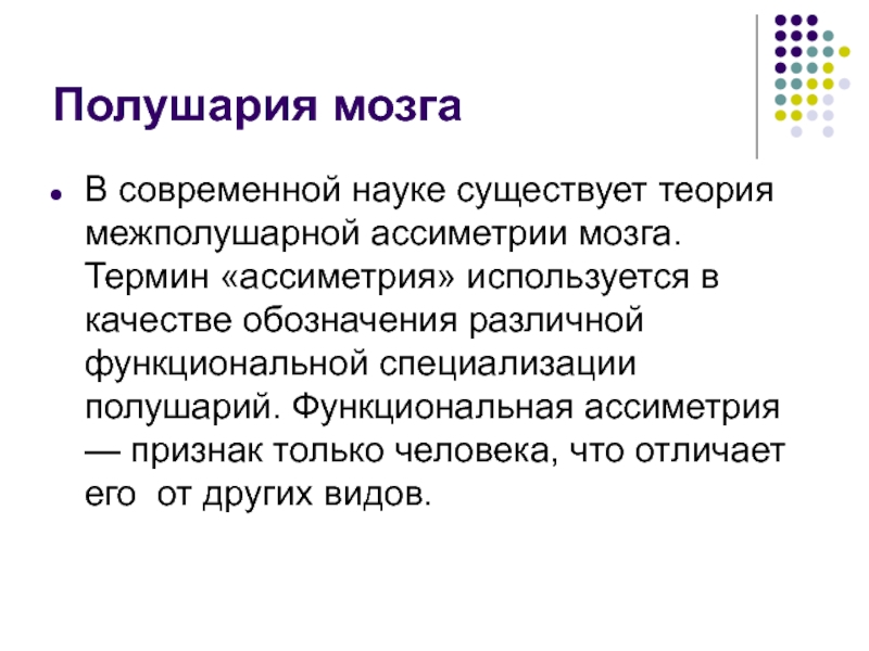 В современной науке существует теория межполушарной ассиметрии мозга. Термин