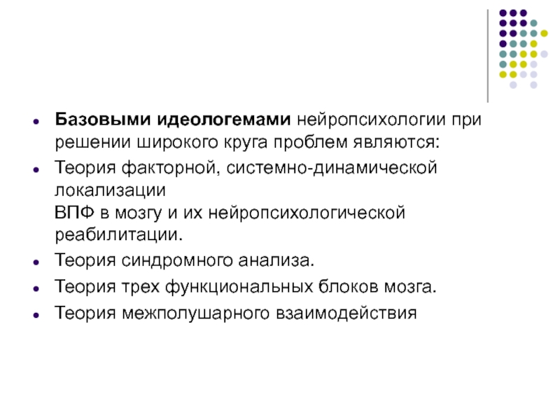 Слайд 12Базовыми идеологемами нейропсихологии при решении широкого круга проблем являются: