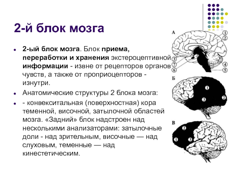 - конвекситальная (поверхностная) кора теменной, височной, затылочной областей мозга. «Задний» блок надстроен над несколькими анализаторами: затылочные доли - над зрительным, височные — над слуховым, теменные — над кинестетическим.
