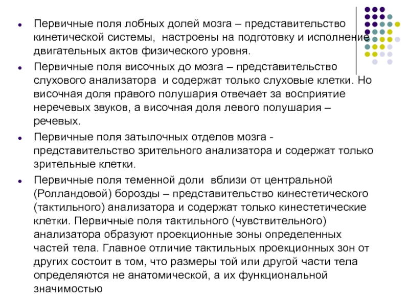 Первичные поля теменной доли вблизи от центральной (Ролландовой) борозды – представительство кинестетического (тактильного) анализатора и содержат только кинестетические клетки. Первичные поля тактильного (чувствительного) анализатора образуют проекционные зоны определенных частей тела. Главное отличие тактильных проекционных зон от других состоит в том, что размеры той или другой части тела определяются не анатомической, а их функциональной значимостью