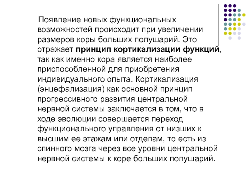 функций, так как именно кора является наиболее приспособленной для приобретения индивидуального опыта. Кортикализация (энцефализация) как основной принцип прогрессивного развития центральной нервной системы заключается в том, что в ходе эволюции совершается переход функционального управления от низших к высшим ее этажам или отделам, то есть из спинного мозга через все уровни центральной нервной системы к коре больших полушарий.