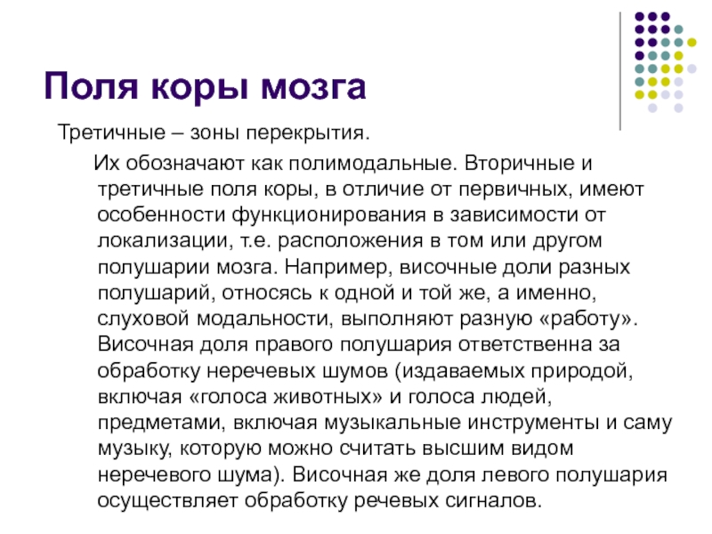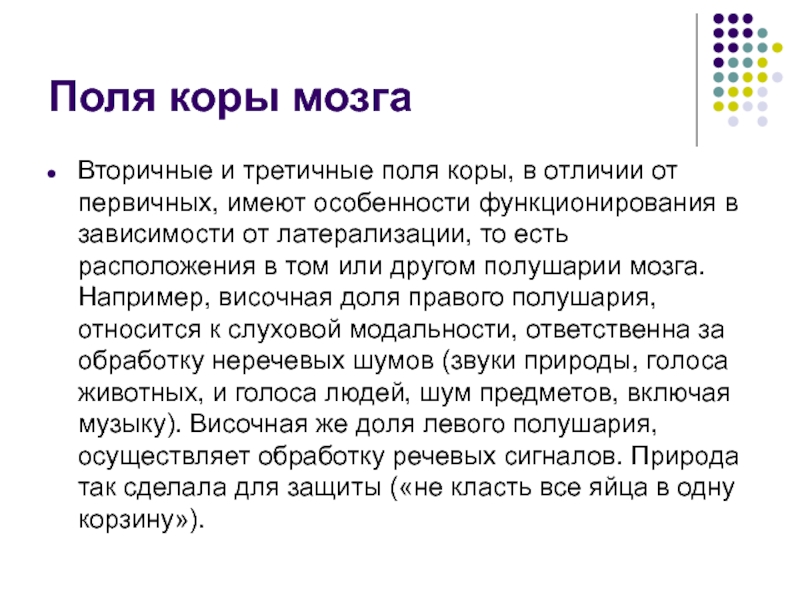 первичных, имеют особенности функционирования в зависимости от локализации, т.е. расположения в том или другом полушарии мозга. Например, височные доли разных полушарий, относясь к одной и той же, а именно, слуховой модальности, выполняют разную «работу». Височная доля правого полушария ответственна за обработку неречевых шумов (издаваемых природой, включая «голоса животных» и голоса людей, предметами, включая музыкальные инструменты и саму музыку, которую можно считать высшим видом неречевого шума). Височная же доля левого полушария осуществляет обработку речевых сигналов.