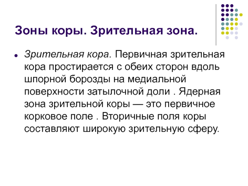 . Ядерная зона зрительной коры — это первичное корковое поле . Вторичные поля коры составляют широкую зрительную сферу.