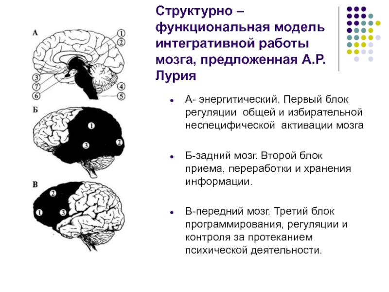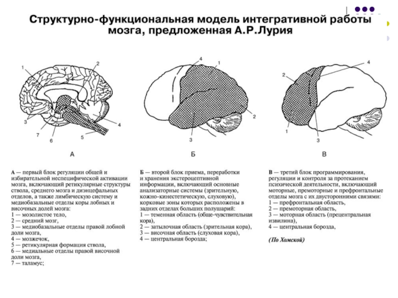 Слайд 18Структурно – функциональная модель интегративной работы мозга, предложенная А.Р.Лурия