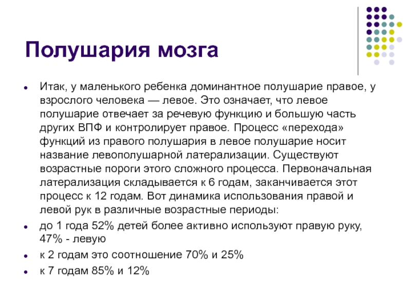 Итак, у маленького ребенка доминантное полушарие правое, у взрослого