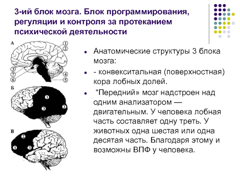 В-передний мозг. Третий блок программирования, регуляции и контроля за протеканием психической деятельности.