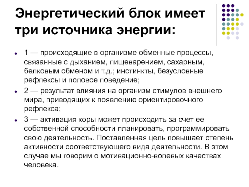 3 — активация коры может происходить за счет ее собственной способности планировать, программировать свою деятельность. Поставленная цель повышает степень активности соответствующего вида деятельности. В этом случае мы говорим о мотивационно-волевых качествах человека.