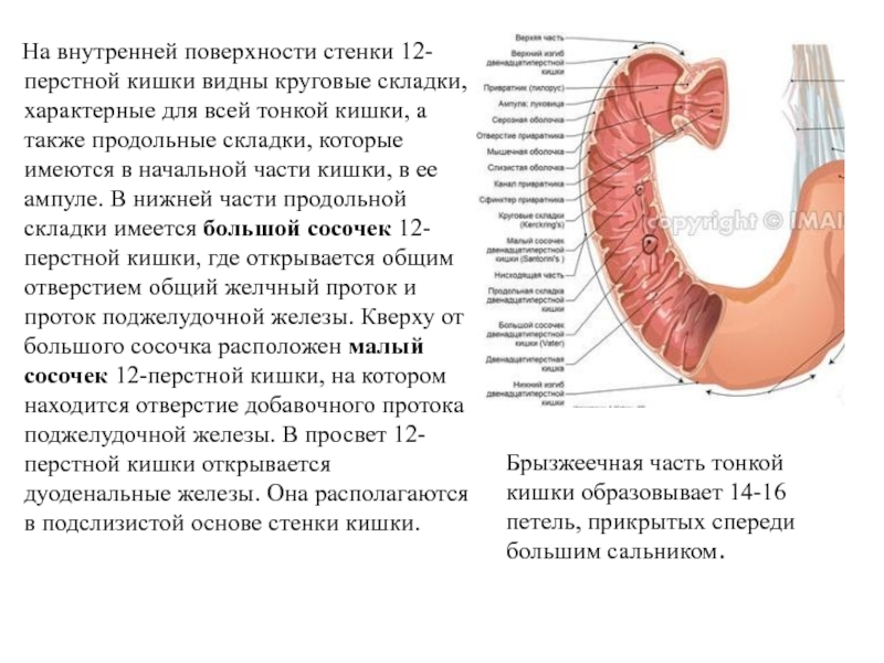 Брызжеечная часть тонкой кишки образовывает 14-16 петель, прикрытых спереди большим сальником.
